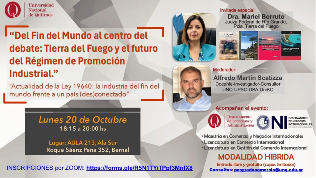 La actividad fue impulsada por el profesor Alfredo Martín Scatizza, docente-investigador del Departamento de Economía y Administración de la UNQ, y contó con la participación destacada de la Dra. Mariel Borruto, Jueza Federal de Río Grande y reconocida especialista en el Régimen de Promoción Industrial de Tierra del Fuego, autora de diversos libros y trabajos académicos sobre la temática.